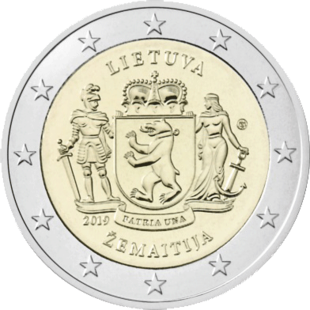 Auf der Bildseite ist das Wappen der ethnographischen Region Samogitien zu sehen. In der Münzmitte ein nach links blickender, grimmiger Bär mit Kette um den Hals im gekrönten Wappen, links geprägt ein Ritter mit Schwert und rechts davon eine weibliche Person mit Anker, als Symbol für Seefahrt und lettische Hanse. Unterhalb der Wappenspruch „PATRIA UNA” (dt. sinngemäß Ein Vaterland). Ursprünglich sollte die Münze bereits im April erscheinen.